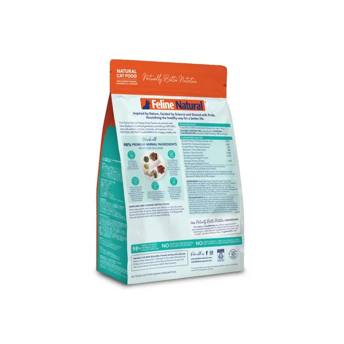 Our freeze-dried Beef & Hoki Feasts are expertly crafted for whole-body health, and made with 98% grass-fed and grass-finished, free-range, beef and organs, wild-caught hoki fish, along with green-lipped mussels, vitamins, minerals and taurine. Packed with New Zealand wholefood goodness, providing a natural diet rich in protein and nutrients for a happy, healthy cat. Energy and taste they'll love